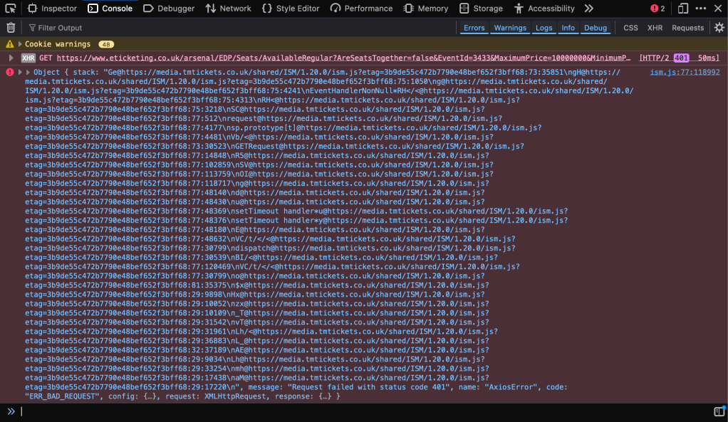 - After five or so minutes of doing the above technique, your session will need to be re-validated by completing a captcha. You will know when this needs to be done when an error is displayed in the console window. It will look something like this: