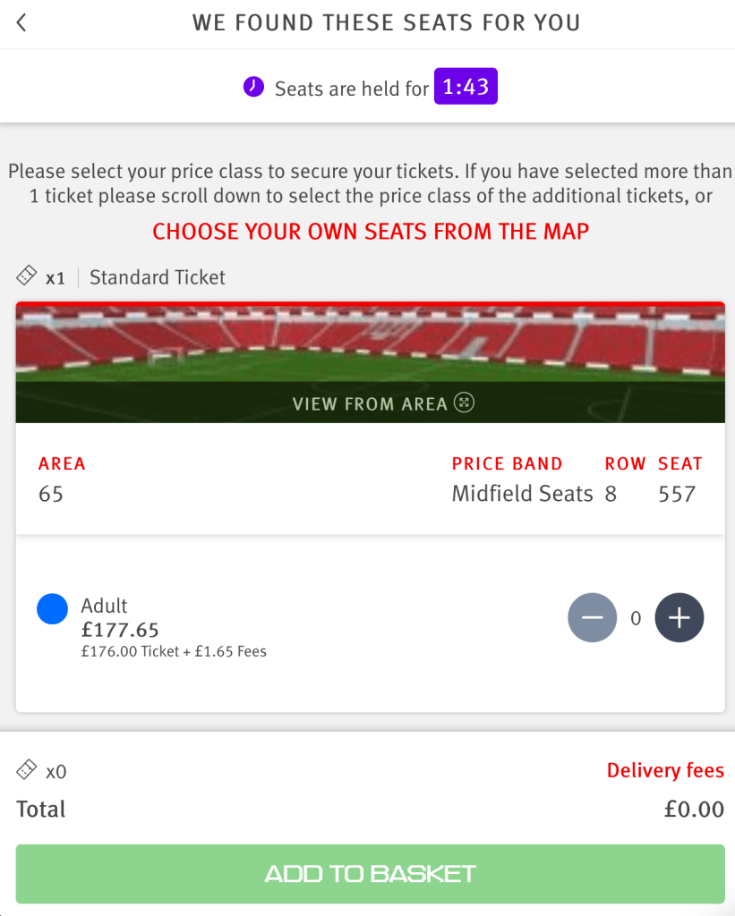 - If you see the above, this means you have successfully secured the ticket, and it will be held for you for 2 minutes whilst you decide if you want the ticket or not. If you want the ticket, click the plus arrow and then add it to your basket. You can then check out.